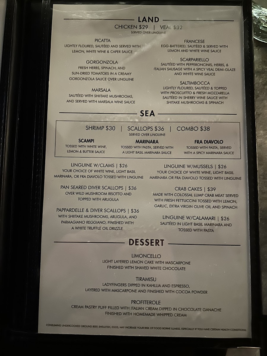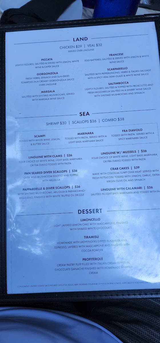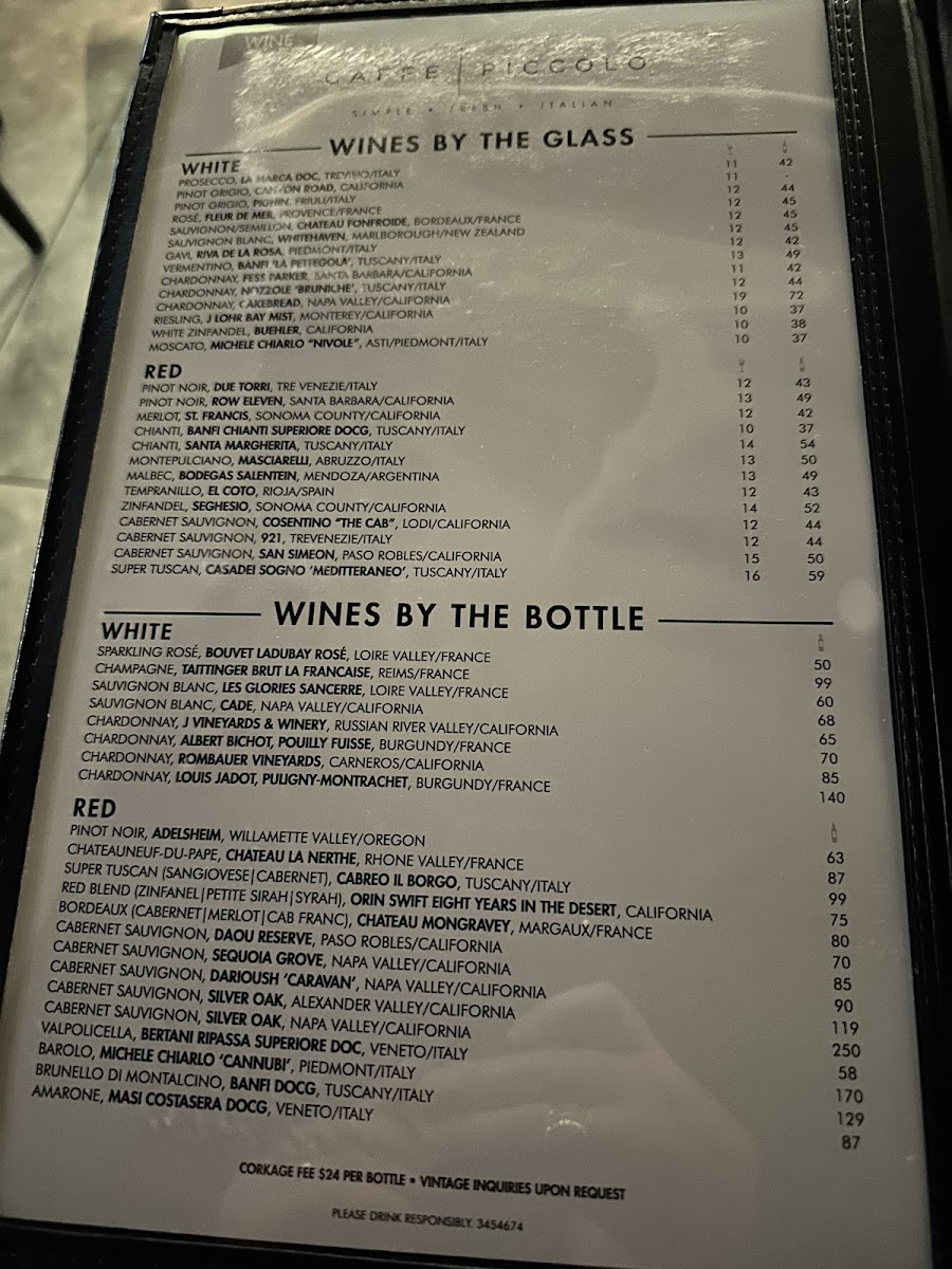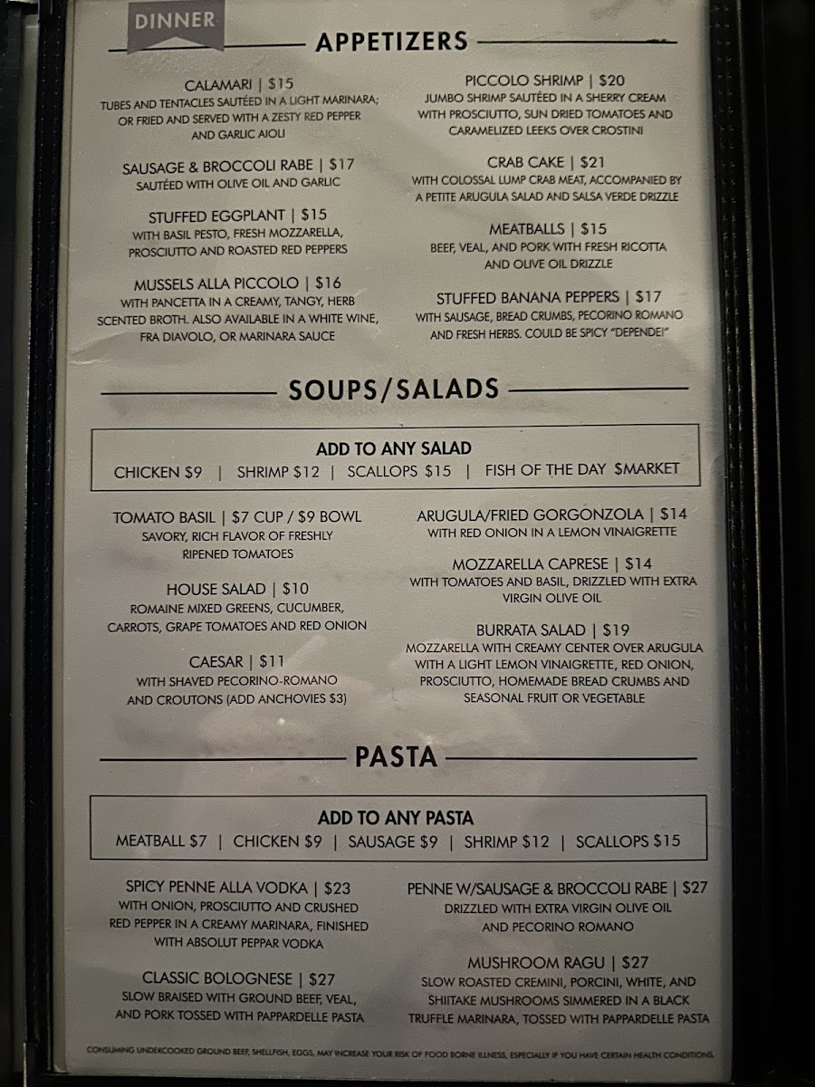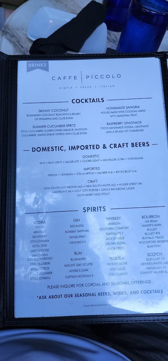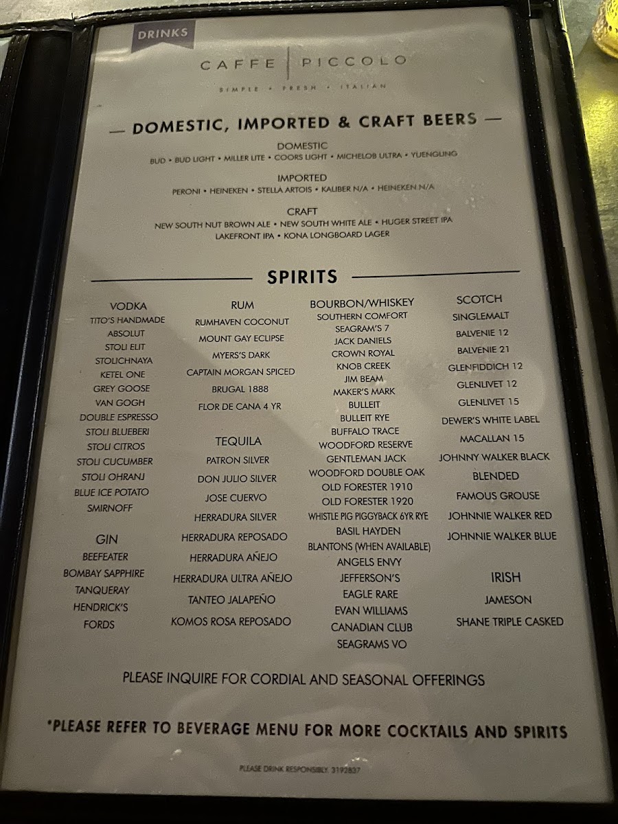 The crab cake appetizer brings a good start to the meal but varies in execution. Diners often note the generous portions, especially with entrées like chicken franchise and chicken saltimboca, creating an opportunity for sharing. While the atmosphere can get lively with noise, the attentive service, particularly from staff like Spencer and Amy, contributes positively to the dining experience. With a mix of highs and lows, Caffe Piccolo remains a local favorite worth exploring.